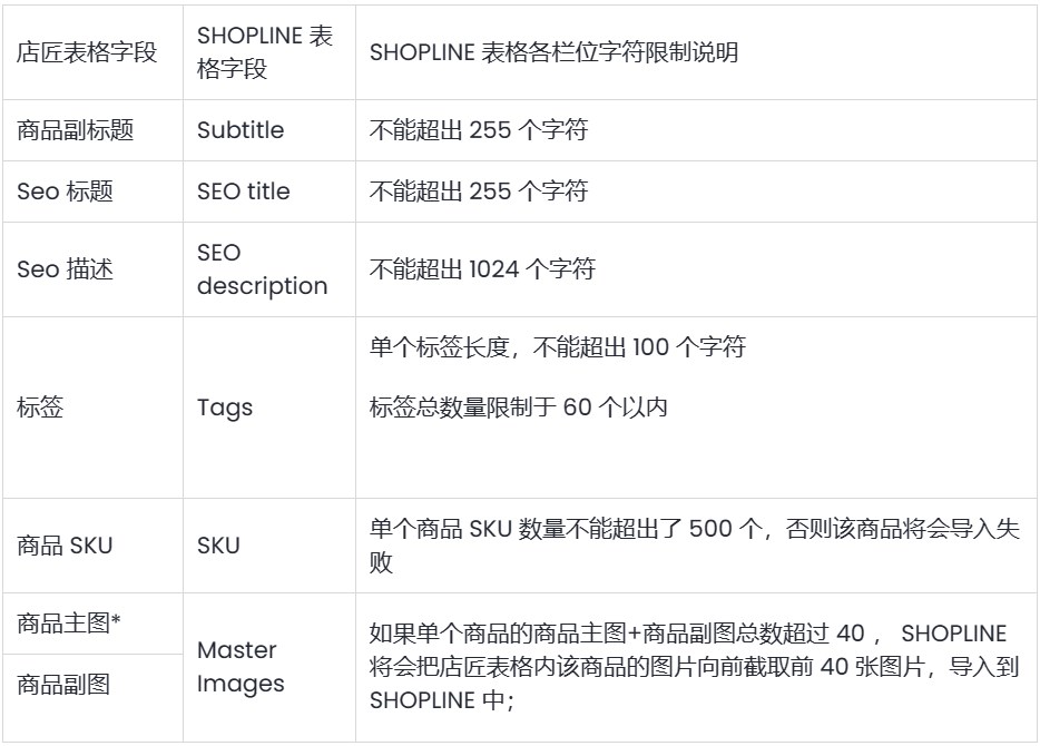 - 部分字段将被特殊处理:由于 SHOPLINE 与店匠 Shoplazza 表格中,对于不同字段的字符数限制不同,所以某些字段若输入了过长的字符,则会保留部分字符或导入失败。涉及字段及说明如下: