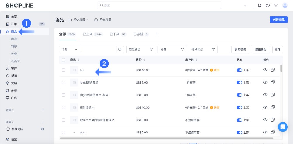 - 可以在 SHOPLINE 后台的【商品】页面中查看、添加、更新和整理所有的商品以及多属性;