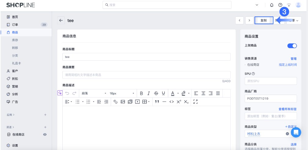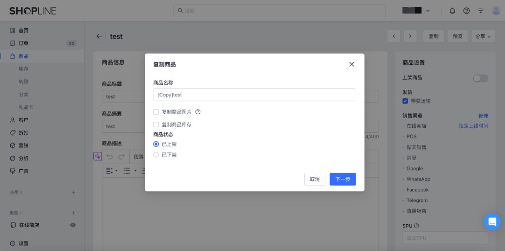 为了帮助在店铺内快速创建有相似属性、类型、内容的商品,SHOPLINE 提供了商品复制功能供快速复制已有商品来创建新商品。