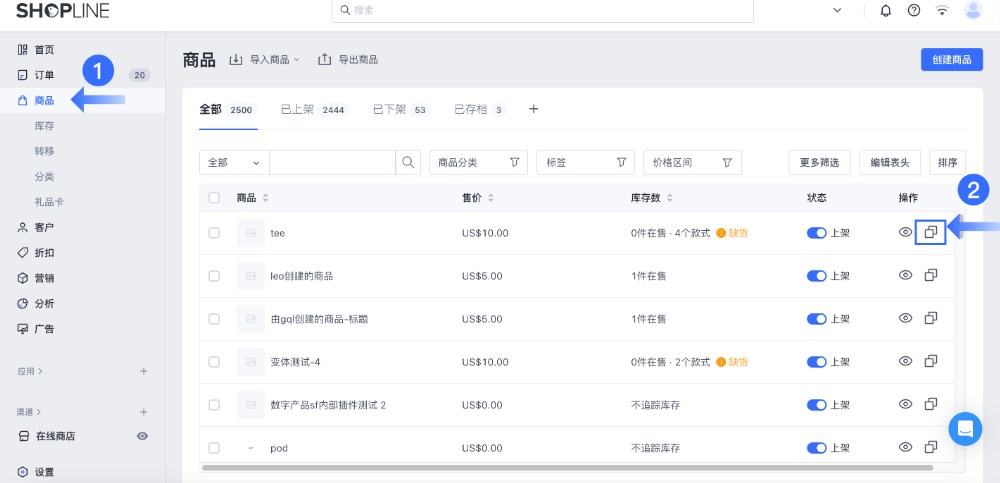 在 SHOPLINE admin 中,点击【商品】,进入商品列表操作列,点击商品右侧的复制按钮来复制商品。点击后将会弹出商品复制设置弹窗,设置项逻辑同”在商品编辑页复制商品“。