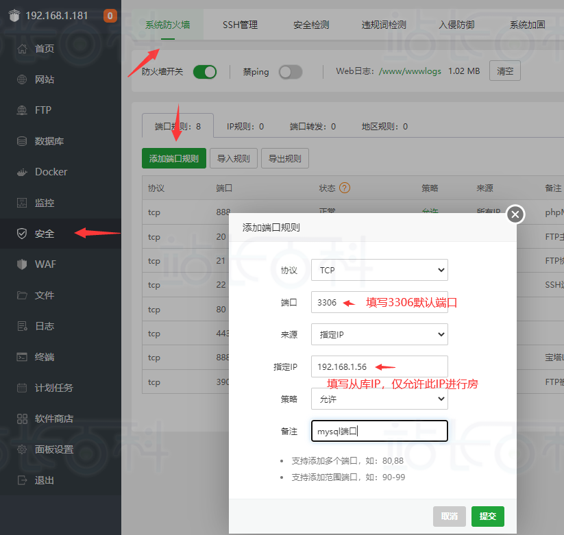 2、在主库服务器上放行3306端口,允许从服务器进行连接。