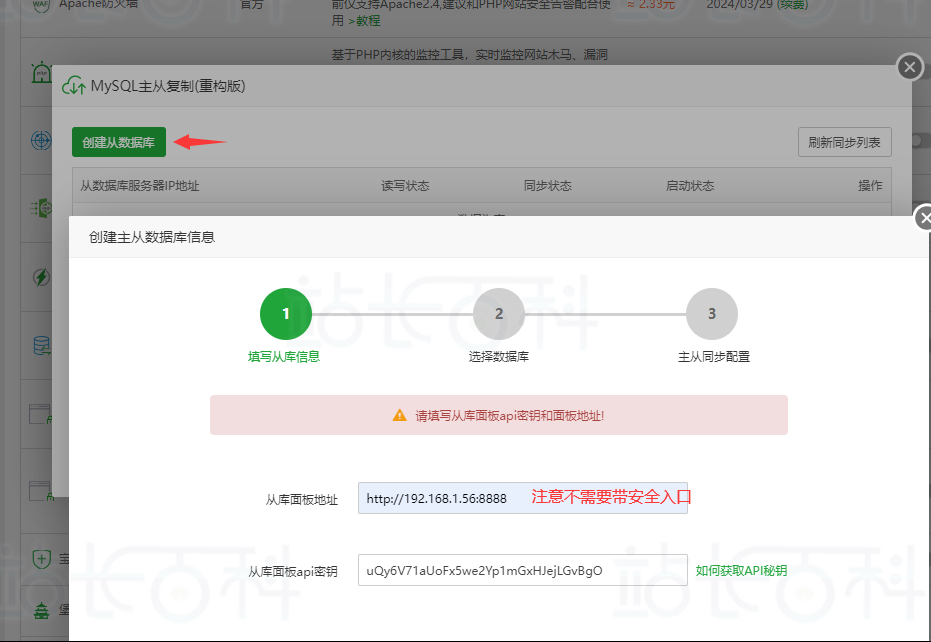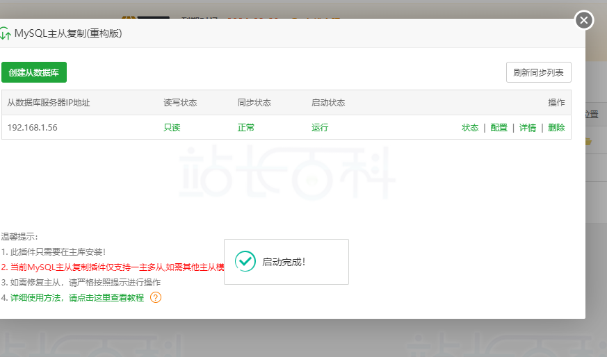 - 在第一次添加同步数据库时,会触发MySQL重启。因为创建主从设置需要修改MySQL配置文件,修改配置文件后需要通过重启MySQL才能重新加载新的配置。