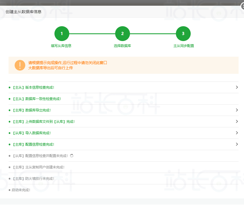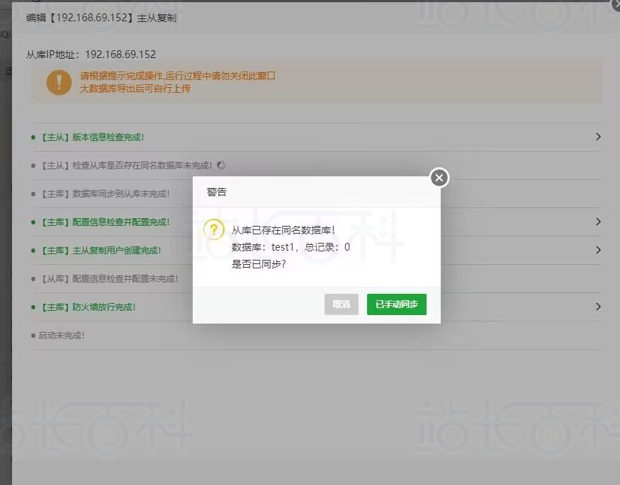 1、如果在从库中存在同名数据库,系统将提示是否已手动进行过数据同步;