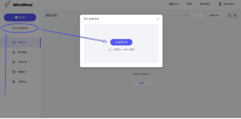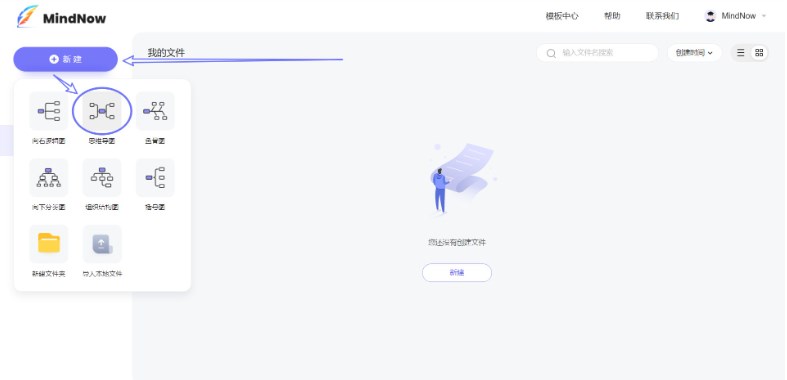进入MindNow官网首页(www.mindnow.cn),登录后点击『进入我的文件』,在个人文件页面的左上角点击『新建』按钮,选择自己需要的结构。
