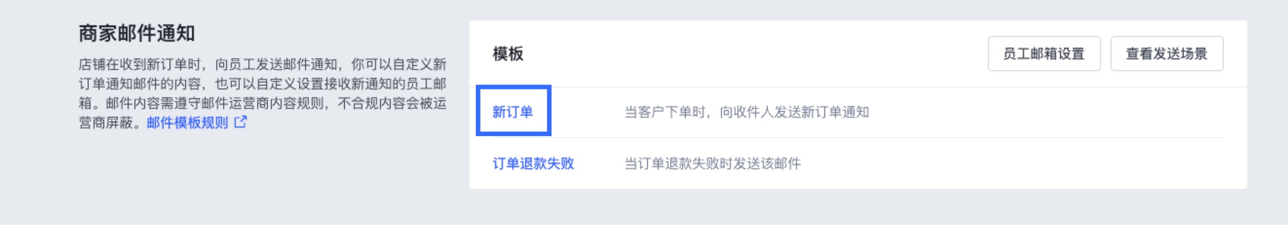 1、在 SHOPLINE admin 中,点击【设置】>【通知】,找到【商家邮件通知】>【新订单】。