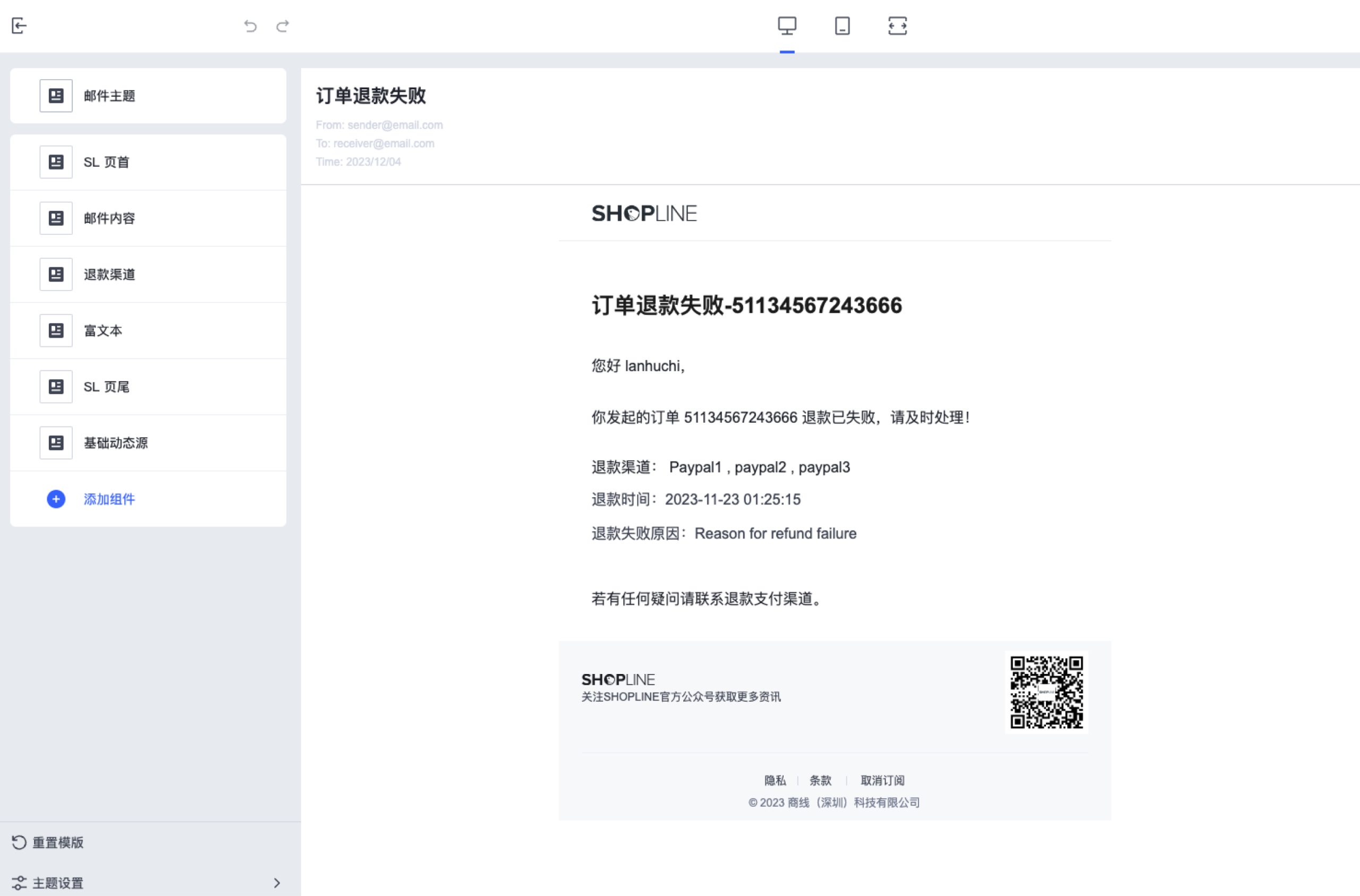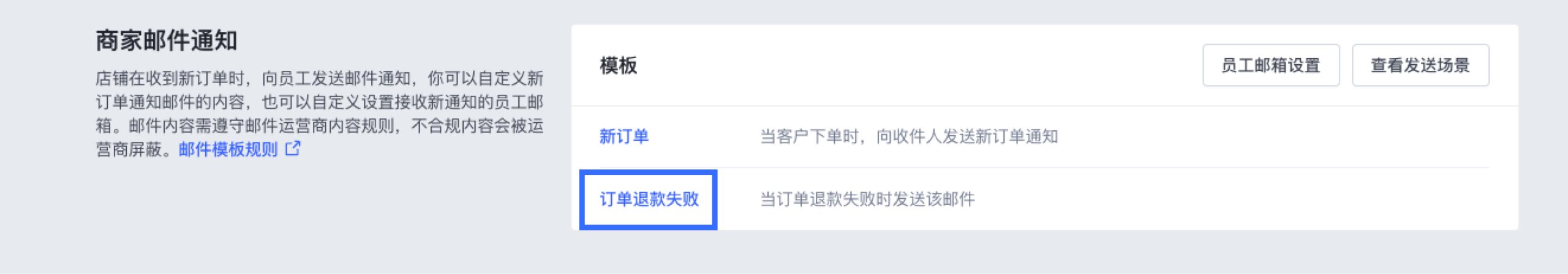 当店铺订单退款失败时,SHOPLINE 将通过邮件的形式通知,根据情况对退款进行重新处理。