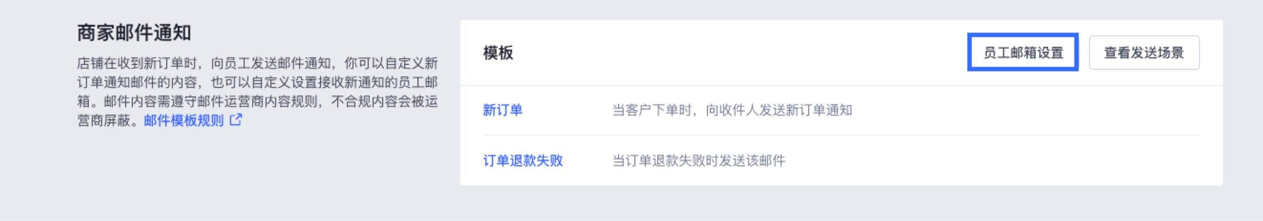 在 SHOPLINE admin 中,点击【设置】>【通知】>【商家邮件通知】>【员工邮箱设置】。