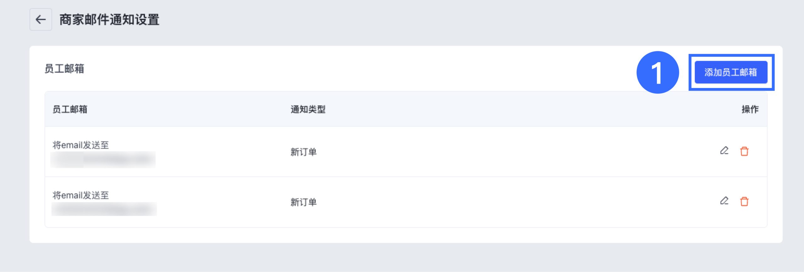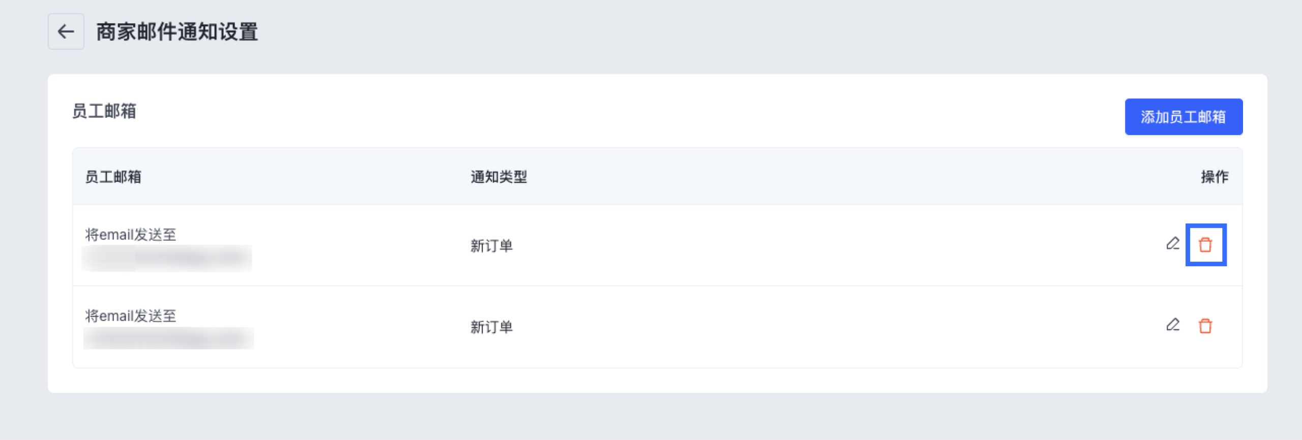 如果员工离职或需要更换订单通知邮箱,可以在商家邮件通知列表中找到需要删除的通知邮箱,点击垃圾桶图标按钮,并在弹窗中确认删除即可。