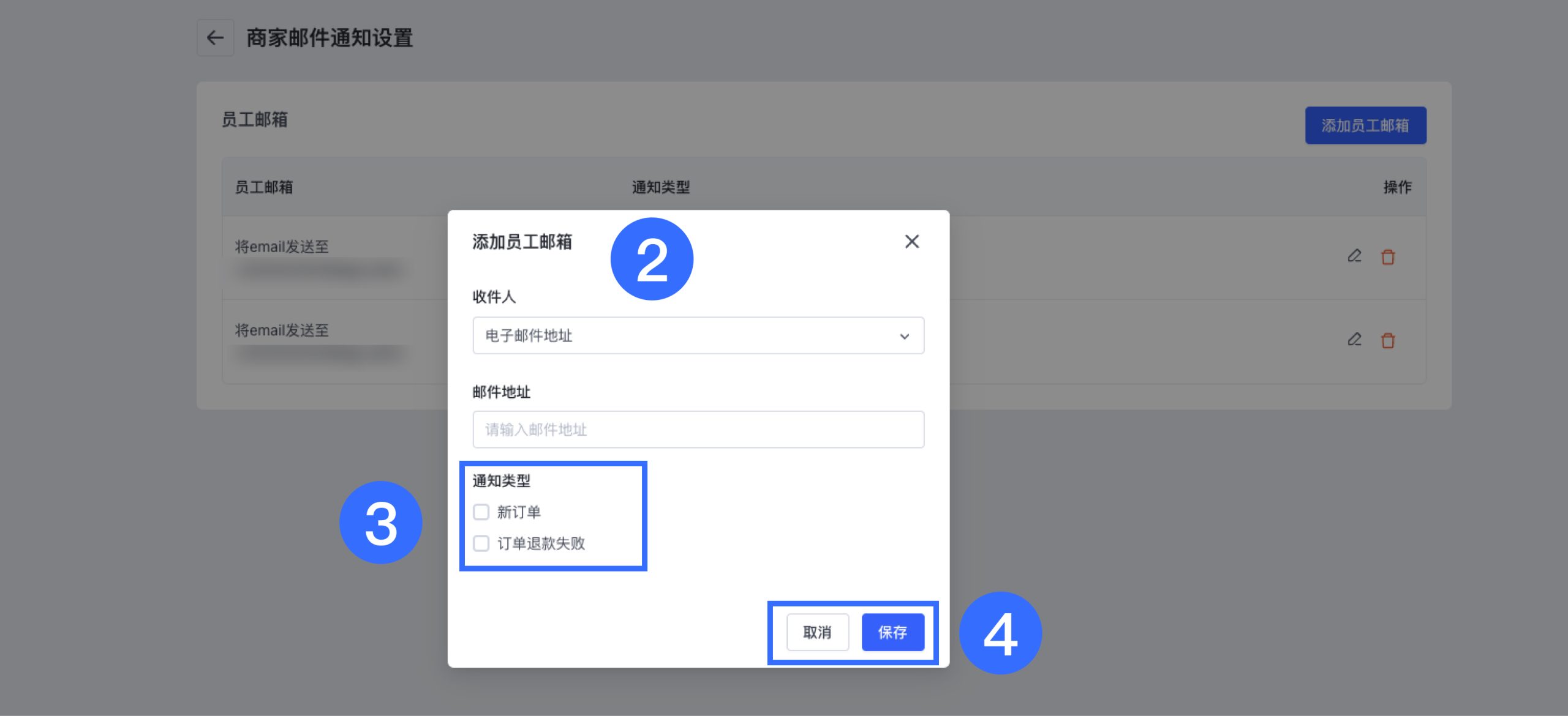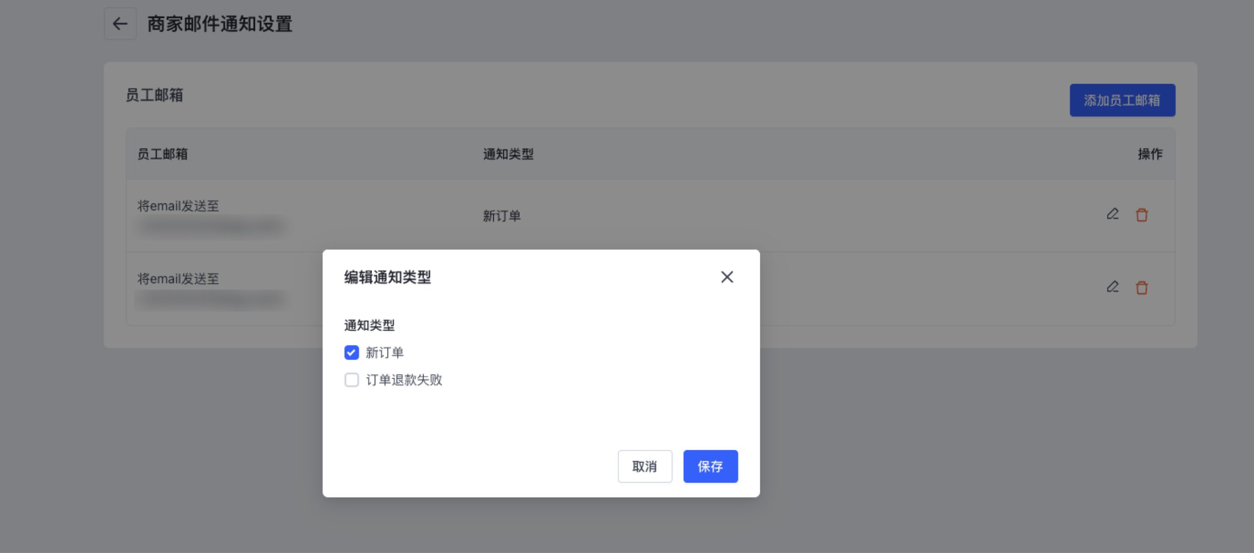 如果想修改员工的通知邮件收取权限,可以点击员工邮箱右侧的编辑按钮,修改其获得【新订单】或【订单退款失败】邮件的通知权限,再点击【保存】即可。
