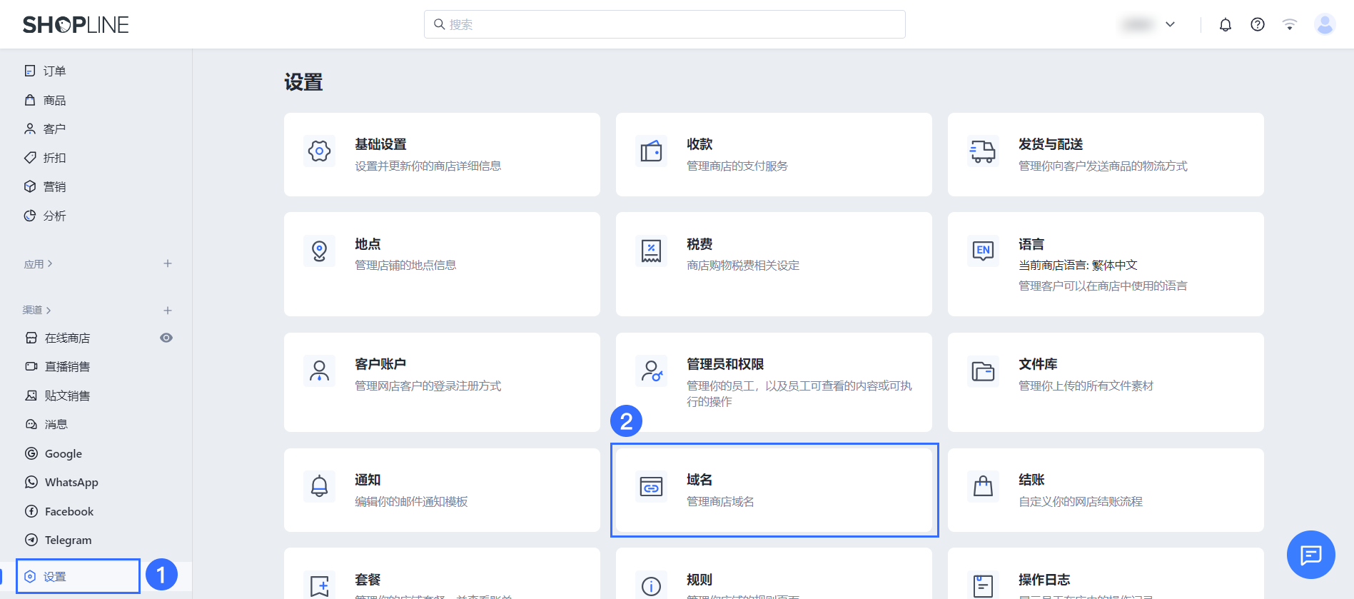1、在 SHOPLINE admin 中,点击【设置】>【域名】。