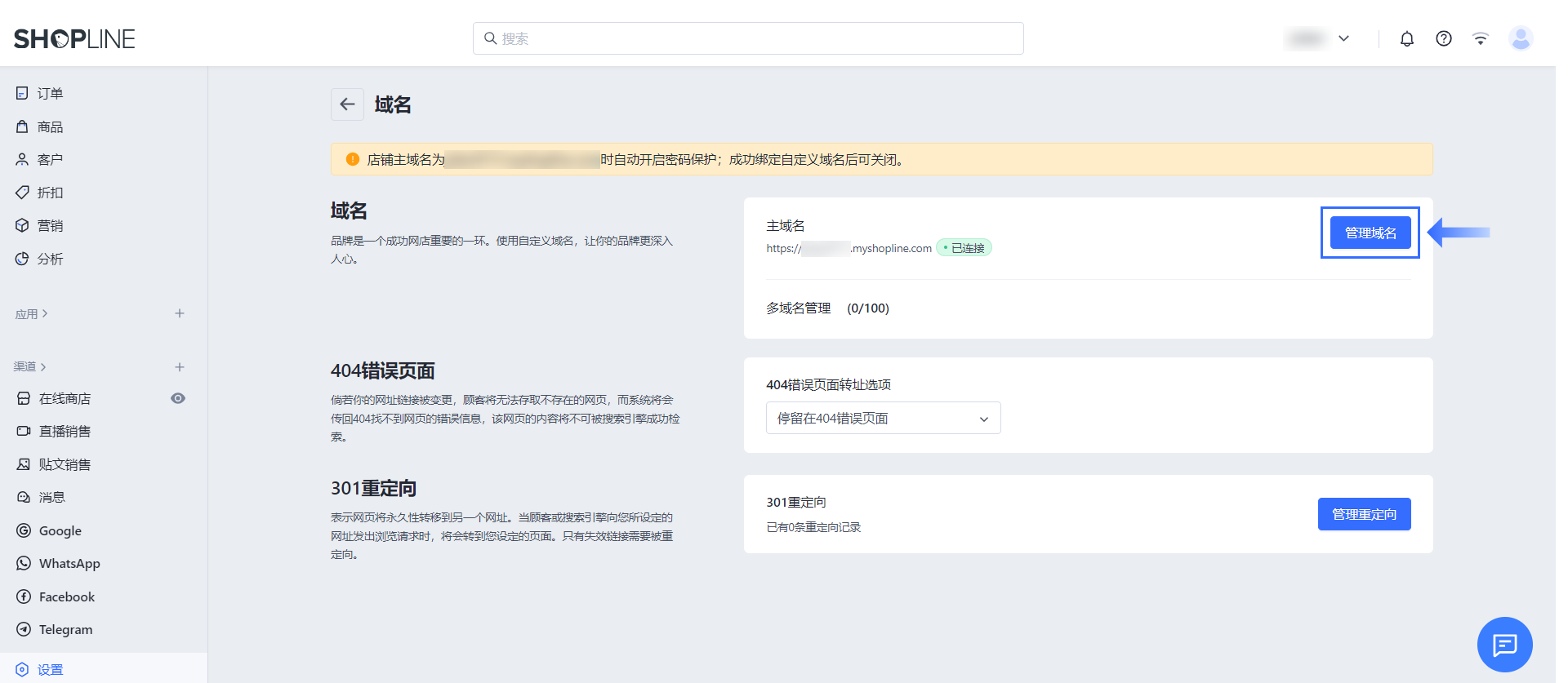 1、在 SHOPLINE admin 中,点击【设置】>【域名】>【管理域名】。