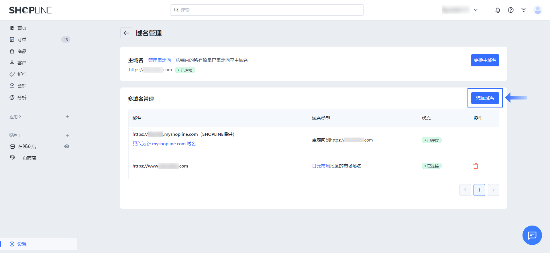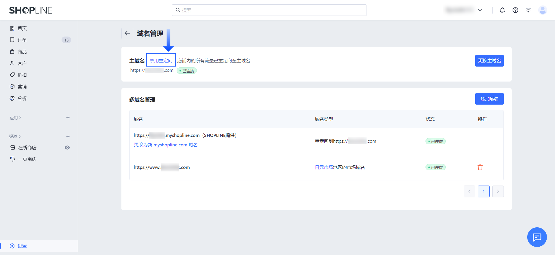 SHOPLINE 支持为店铺添加多个域名,以提高流量并促进转化。此外,平台还提供了设置域名重定向的功能。当开启重定向时,无论客户通过哪个域名进入网站,都会自动跳转至店铺的主域名。而关闭重定向后,客户点击不同的域名进入网站后,前端显示的网址仍保持点击时看到的域名,不会被转换成主域名。