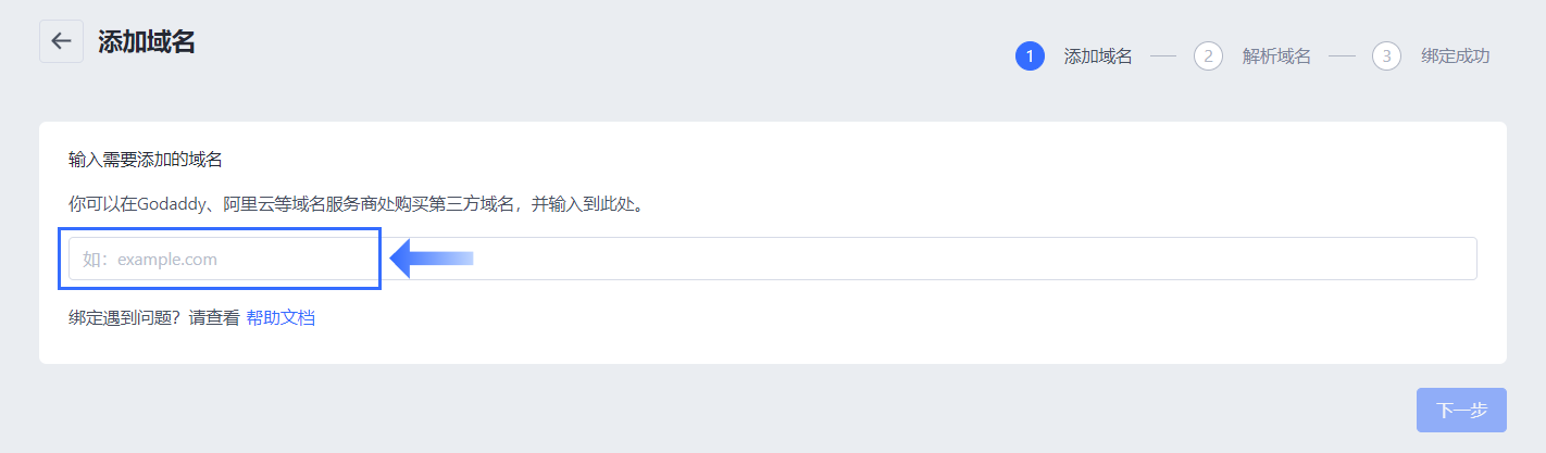 4、将解析好的域名添加到文本框内,然后根据指引完成域名绑定。具体域名绑定流程可以参考: