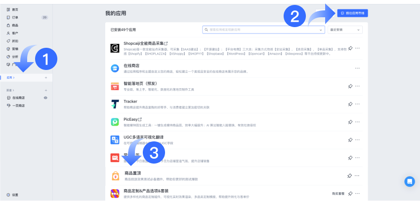 1、打开【SHOPLINE 后台】,点击【应用】>【前往应用市场】。