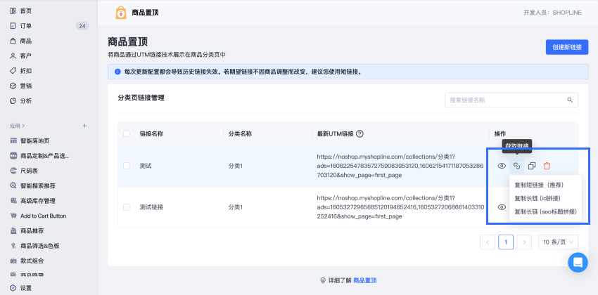 完成商品置顶链接的创建后,可以回到列表页进行链接的查看与管理。