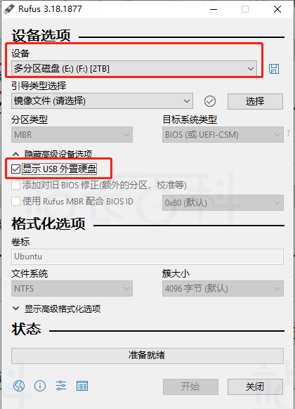 3、勾选【显示USB外置硬盘】,再选择插入的U盘。