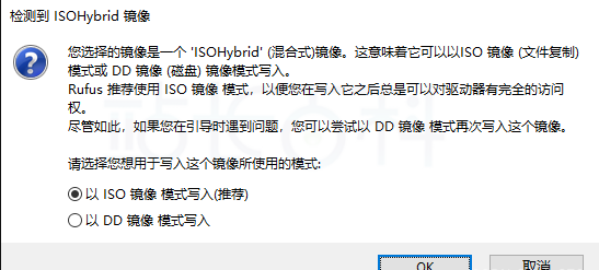 5、保持默认选择【以ISO镜像模式写入】,点击【OK】。