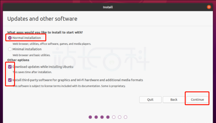 5、点选【Normal install】,勾选Other options下的2个选项,点击【Continue】。