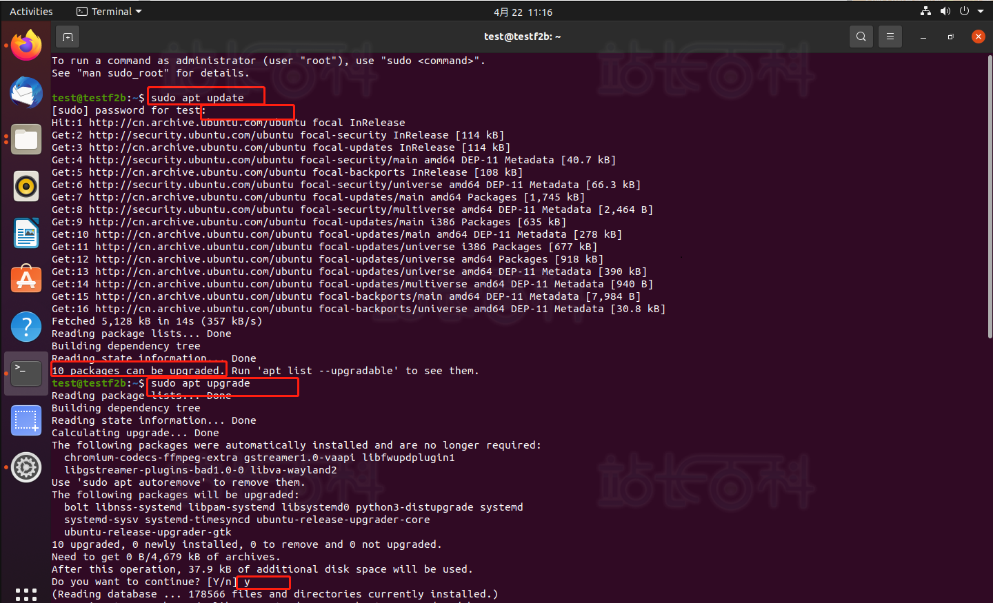 14、使用终端update Ubuntu,使用快捷键【CTRL+ALT+T】打开终端(或者在桌面右键选择【Open in Terminal】),输入:sudo apt update,输入系统密码,可看到有多少可以更新的项,再次输入:sudo apt upgrade,输入:y,进行更新,如下图: