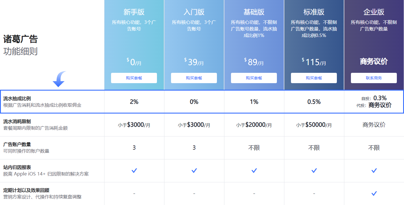 【新手版】【基础版】【标准版】【企业版】有一定比例的佣金抽成,当通过诸葛投放广告产生消耗时,诸葛会根据消耗金额按你订阅的套餐所设定的【流水抽成比例】抽取一定的佣金,而佣金是以积分的形式抵扣的。
