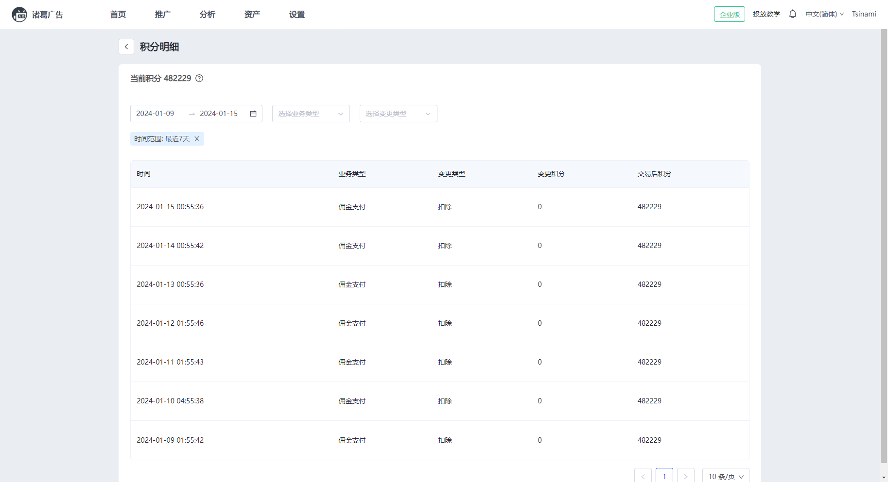 - 例子:订阅了【标准版】套餐,流水抽成比例为5%,积分账户上有1000积分。于2022年7月6号产生了100美元的广告消耗金额,诸葛将会在2022年7月7号从这里抽取佣金费用:100 x 0.5% = 0.5美元,转换成积分为50积分,那么在2022年7月7号,积分账户将会被扣除50积分,最终的余额为950积分。