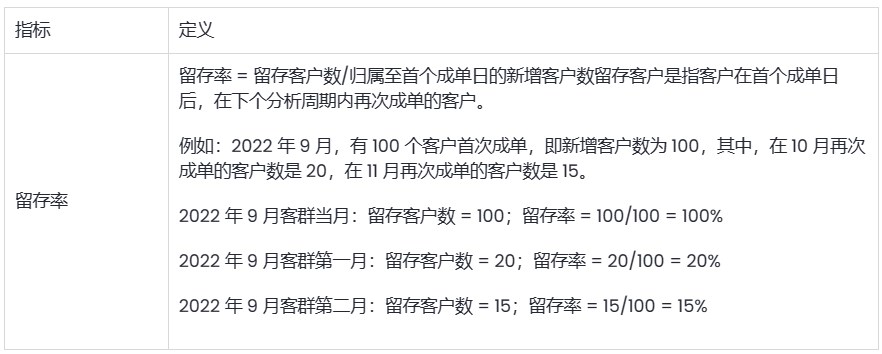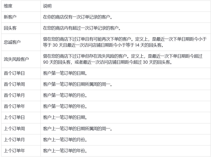 注意:留存表不会显示当前时间段的数据。由于客户群体分析要求客户需要在购买首单后回到商店再次下单,这往往需要一段完整的时间周期走完才能进行运算(比如,如果现在是 2023 年 4 月,并且选择日期范围为过去 6 个月、时间粒度为月,则只会显示 2023 年 3 月及以前的数据)。此外,某个时间段的数据在该时间段结束的 24 小时后显示。