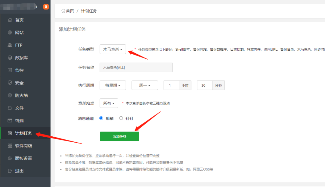 - webshell查杀:面板->计划任务-webshell查杀。