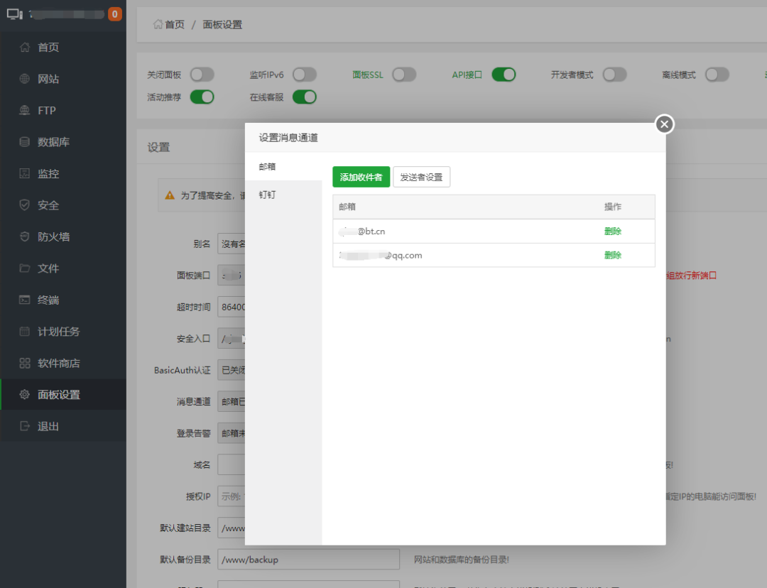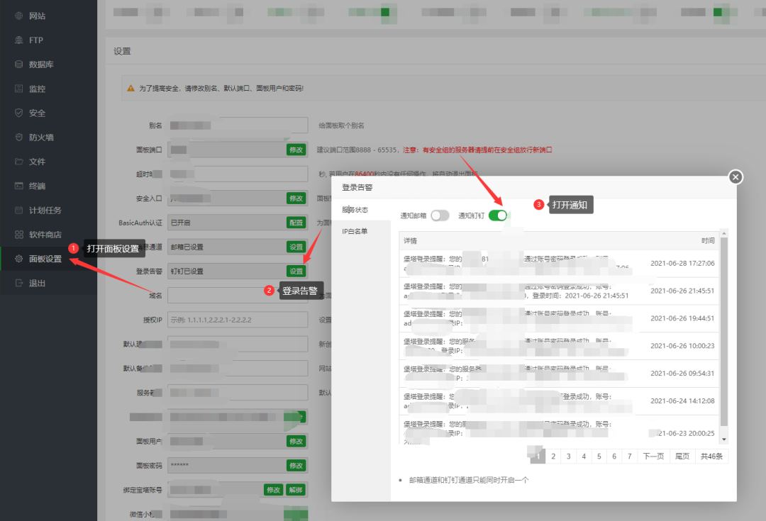 - 登录告警:面板–>设置–>登录告警。