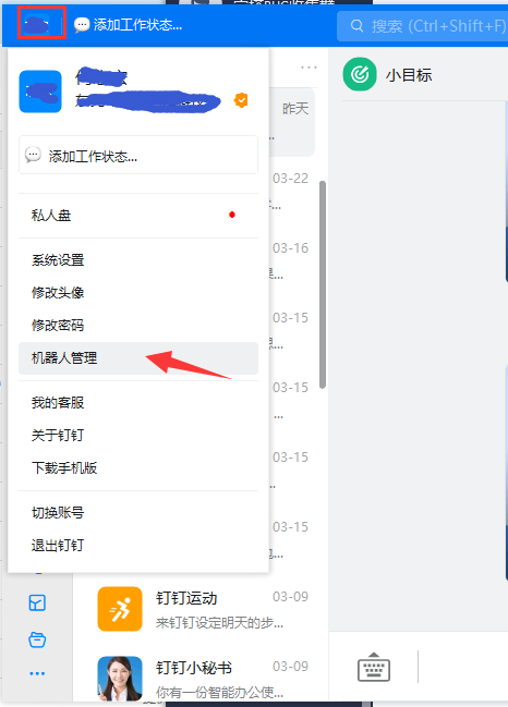 先电脑登录钉钉(这部分过程不演示),然后左上角点头像,出来如下图片,点击机器人管理: