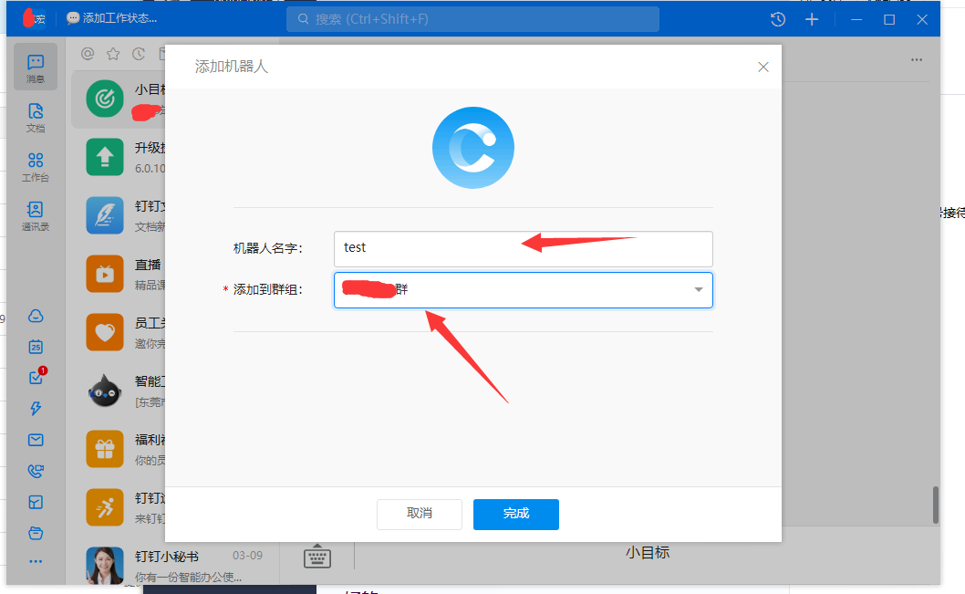 设置机器人名字,选择对应的机器人群组,然后点完成: