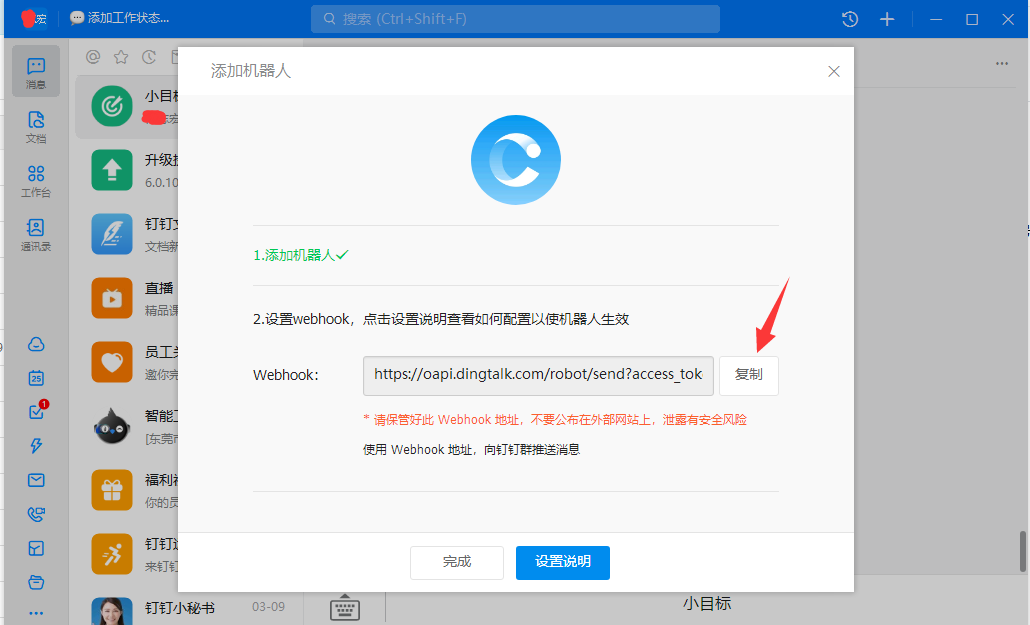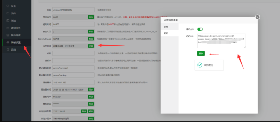 完成后需要在面板上的操作:将钉钉上复制的链接,粘贴至如图位置,点保存即可。