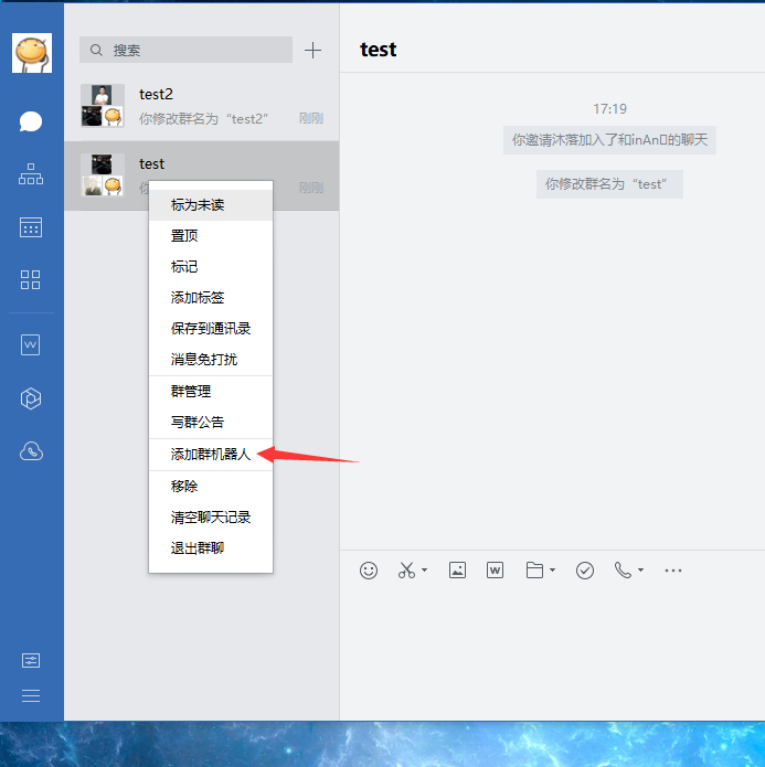 配置企业微信首先需要建立一个群,然后右键添加机器人。
