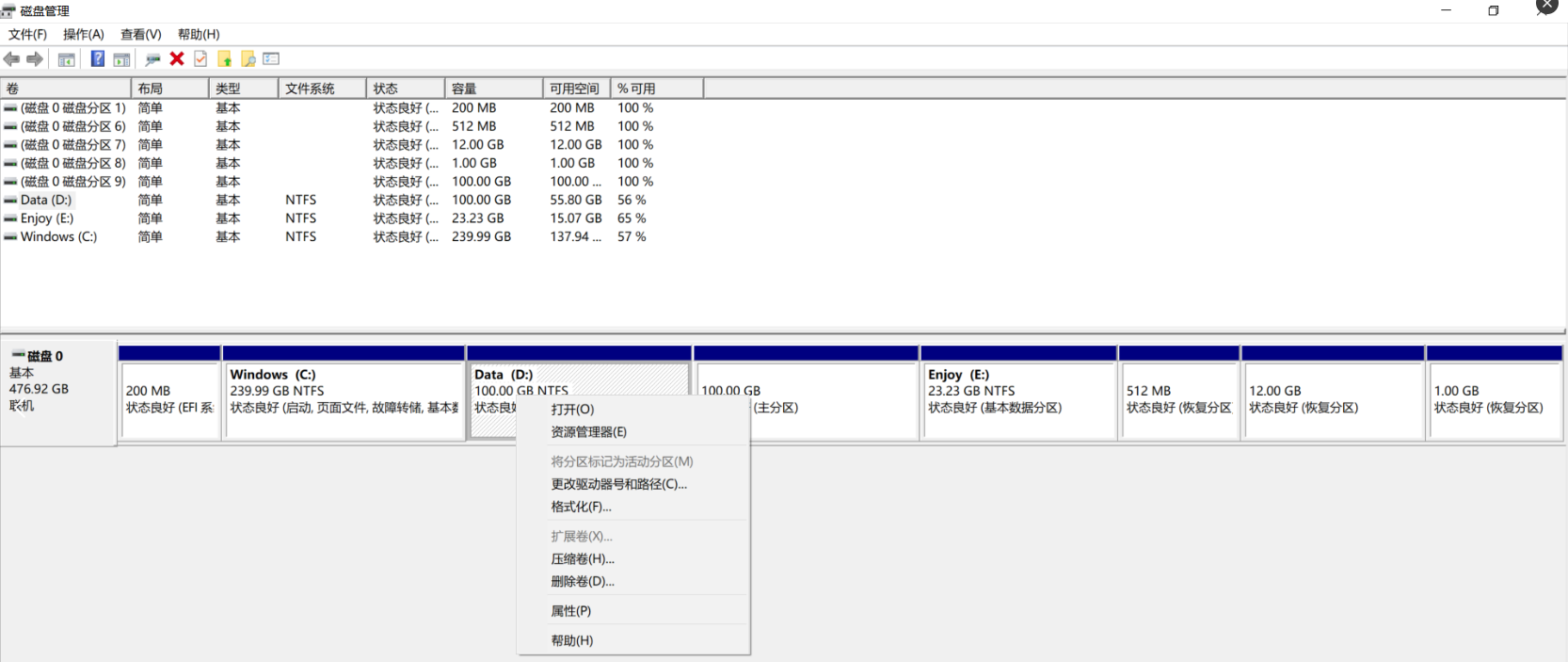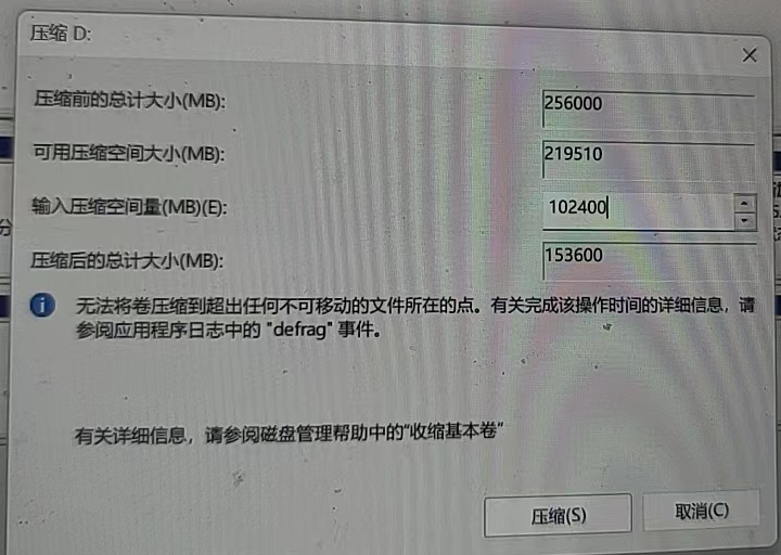 右键点击D盘,选择压缩卷,根据需要选择压缩容量的大小(单位为MB,需将GB转换为MB,例如100GB = 102400MB),即为分配给Linux系统的空间大小。