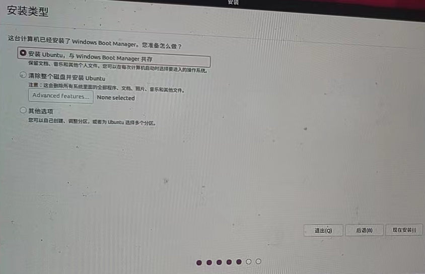 3、选择中文简体,联网,选择Ubuntu与Windows Boot Manager共存,点击现在安装。