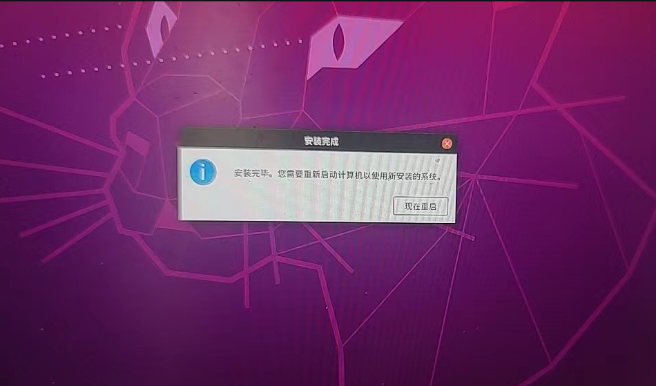 安装完成后,我们会看到如下界面。按回车重启电脑,电脑会提示”Please remove USB”,此时将U盘拔出,然后按回车,完成Ubuntu系统的安装。