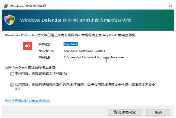 当AnyDesk以免安装模式运行时,在客户端发起第一个连接时,将提示用户允许AnyDesk通过Windows防火墙。