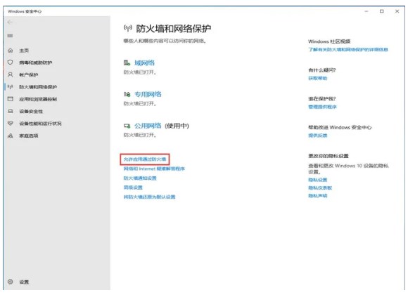 如果这个弹窗之前被拒绝了,可以通过一下路径重新启用:“Windows 设置” > “更新和安全” > “Windows 安全中心” > “防火墙和网络保护” > “允许应用通过防火墙”。