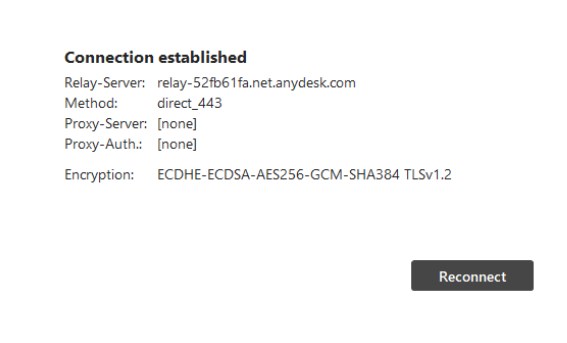 所有AnyDesk会话默认使用TLS 1.2协议和AEAD加密方法进行保护。可以在AnyDesk工具栏的connmode中查看连接类型、是否强制加密模式、客户端验证状态以及指纹信息,有助于确认当前会话的安全状况。