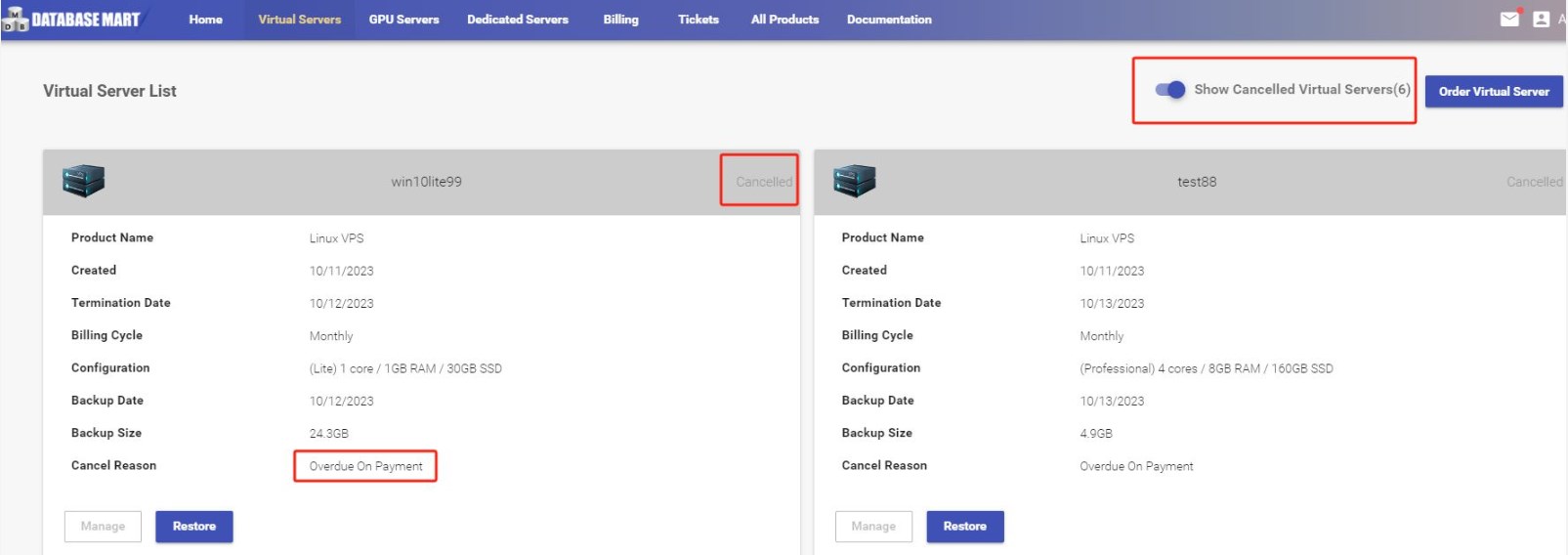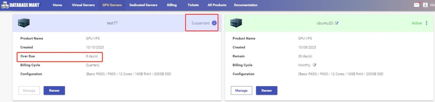 如果服务欠费,就会被暂停或取消。如果服务被暂停,可以点击“续费”按钮支付未付发票。发票支付后,服务器将在5-10分钟内恢复运行。如果服务已经取消,请访问已取消的套餐列表,看是否可以进行恢复。以Database Mart服务商为例: