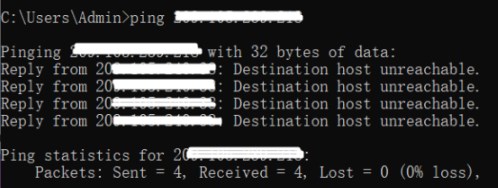 使用Ping命令检查服务器IP。如果收到“目标主机不可达”的结果,表示网络配置存在问题,请立即联系客服帮助检查网络。如果Ping请求超时或有效,请继续使用Telnet命令测试RDP/SSH连接。