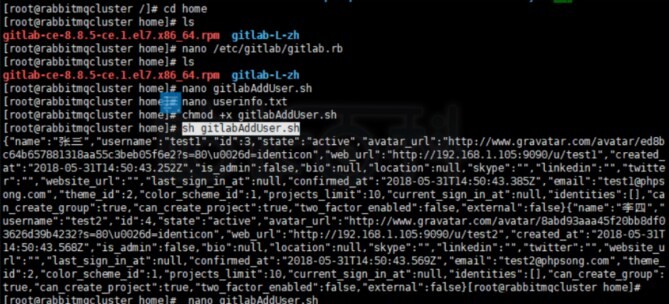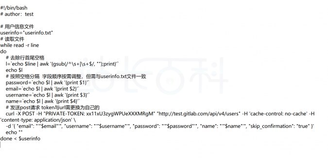 创建一个名为 “gitlabAddUser.sh” 的脚本文件。在该文件中,将 “PRIVATE-TOKEN” 替换为第一步获取的个人访问令牌,并将API地址改为自己GitLab服务器的地址。脚本内容如下: