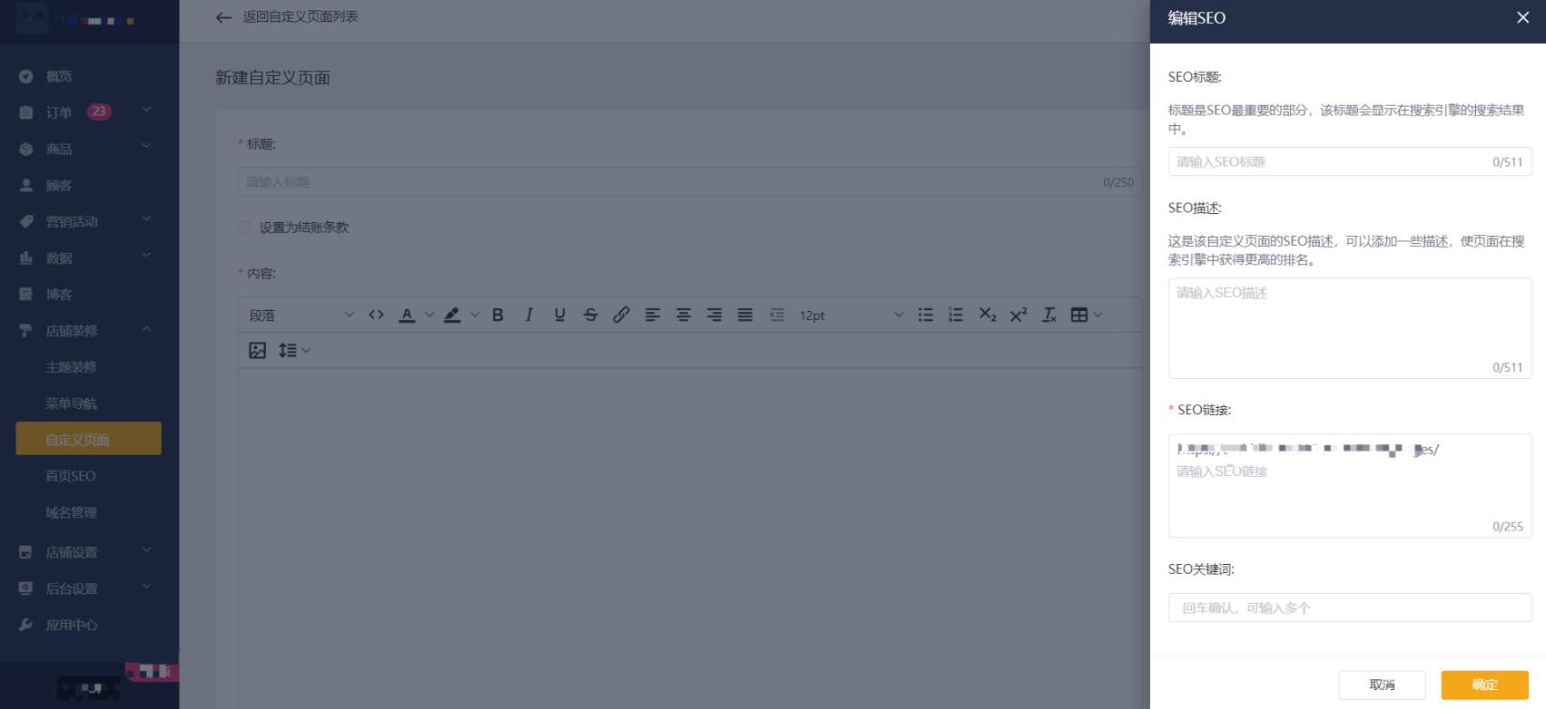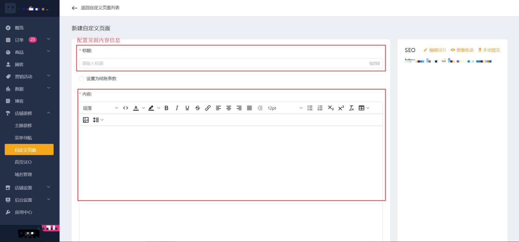点击「店铺装修」>「自定义页面」,然后选择【新建自定义页面】。