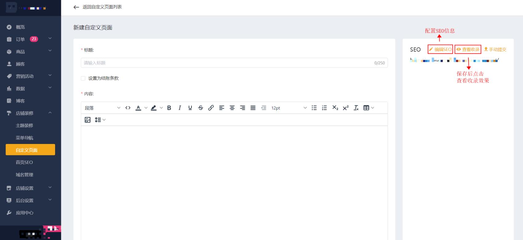 在右侧弹窗中填写SEO标题、描述、链接及关键词。保存后可点击”查看收录”以查看页面效果。