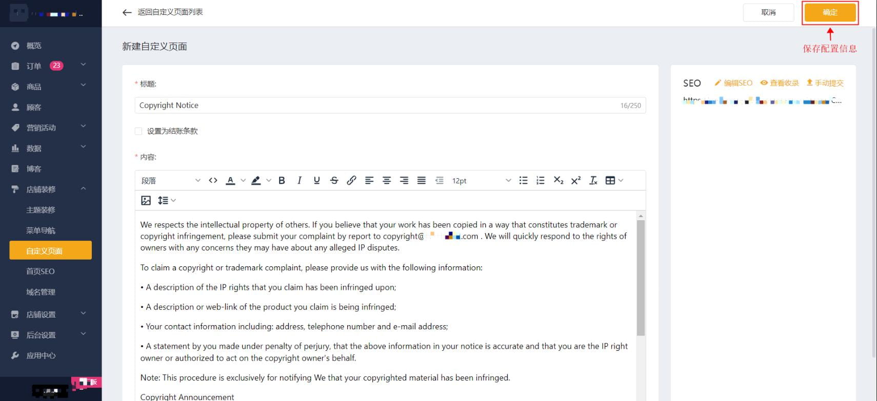 填写页面标题与内容,使用富文本编辑器以实现简单样式编辑。