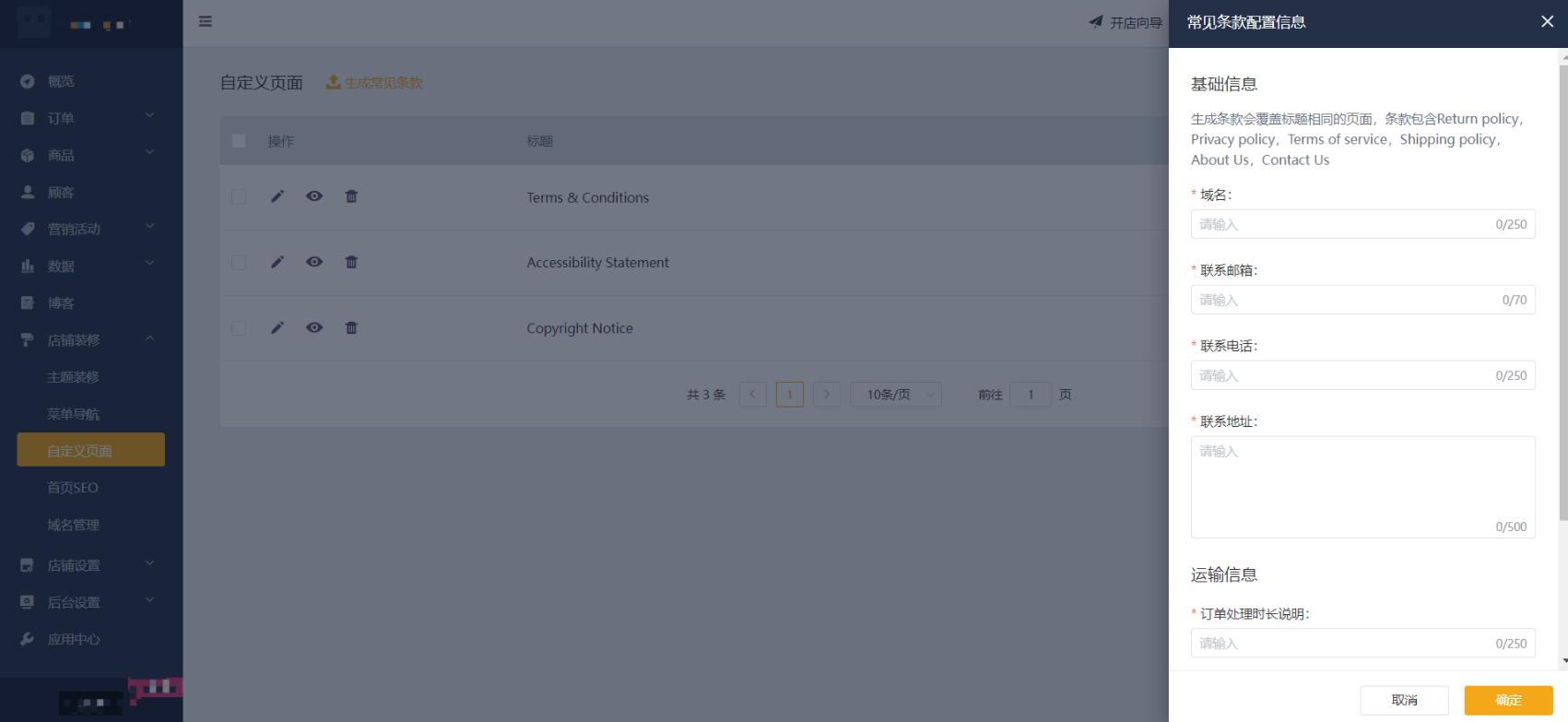 另外还可以一键生成常用条款,只需填写域名、联系邮箱、联系电话、地址、处理时长及运输方式,即可生成Returnpolicy、Privacypolicy、Termsofservice、Shippingpolicy、AboutUs和ContactUs等条款。