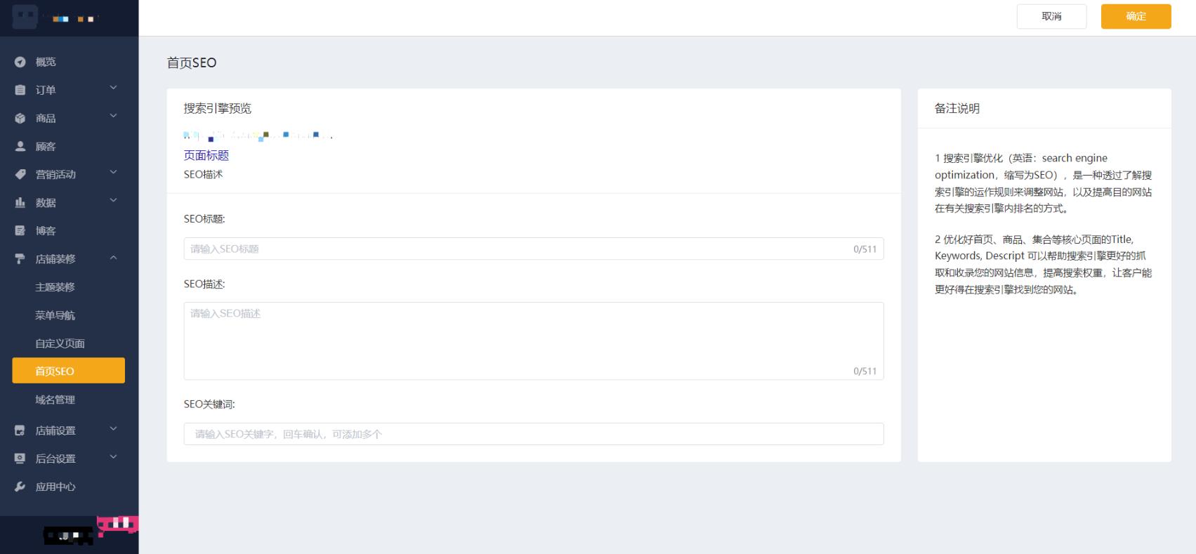 1、点击「店铺装修」>「SEO」,根据需求与实际情况配置SEO信息,完成后点击【确定】保存。