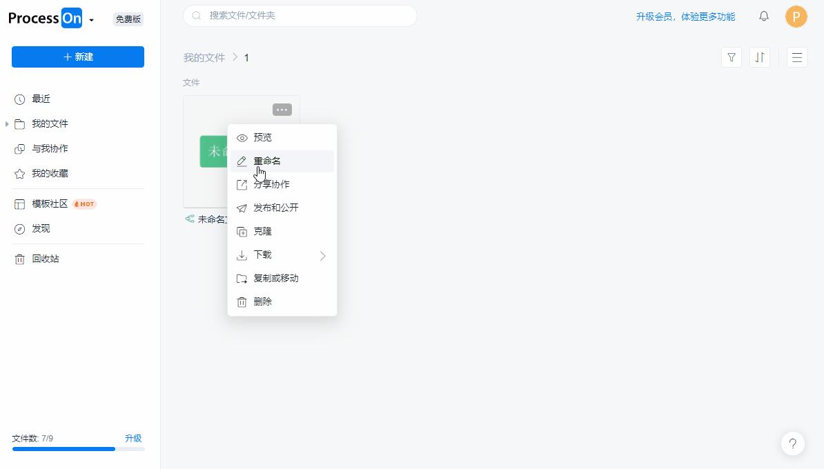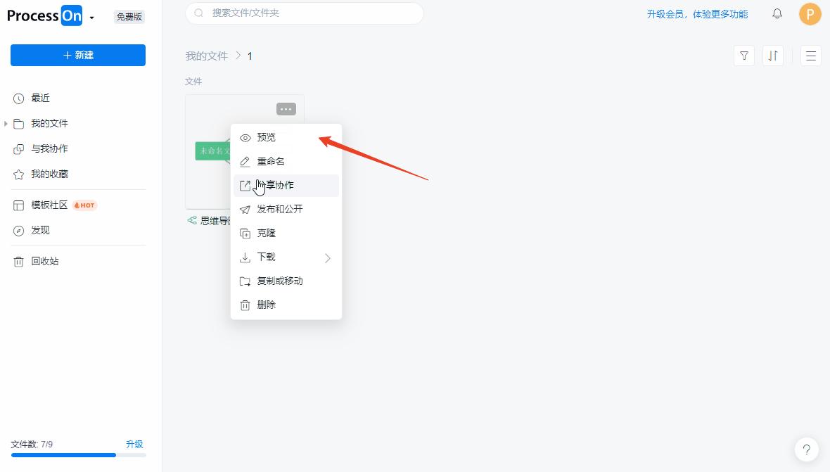 除了协作外,ProcessOn还支持文件的分享功能。鼠标悬停在文件上,右键点击或点击“三点”图标,选择“分享”。分享后,可以生成免登录的链接或二维码,让他人查看文件。