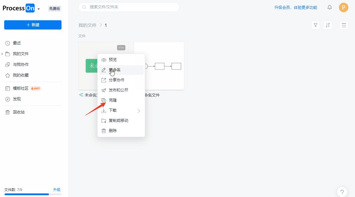 如果希望创建一个相同内容的文件,ProcessOn提供了克隆功能。在个人文件页或设计器页面中,点击“克隆”按钮,直接生成一个相同的文件副本,可以在此基础上进行编辑。