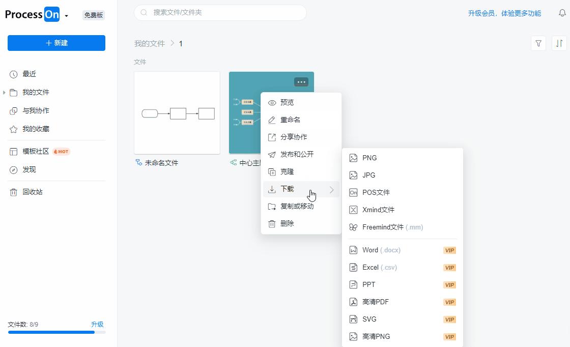 ProcessOn提供多种下载格式,包括PNG、高清PNG、JPG、SVG、高清PDF、POS;思维导图支持下载为Word、PPT、Excel、PNG、高清PNG、JPG、SVG、高清PDF、POS、FreeMind、XMind格式。部分VIP功能可享受更多下载选项。