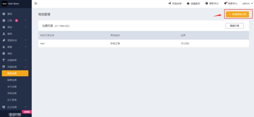 1、在物流设置页面,点击【新建物流方案】按钮。